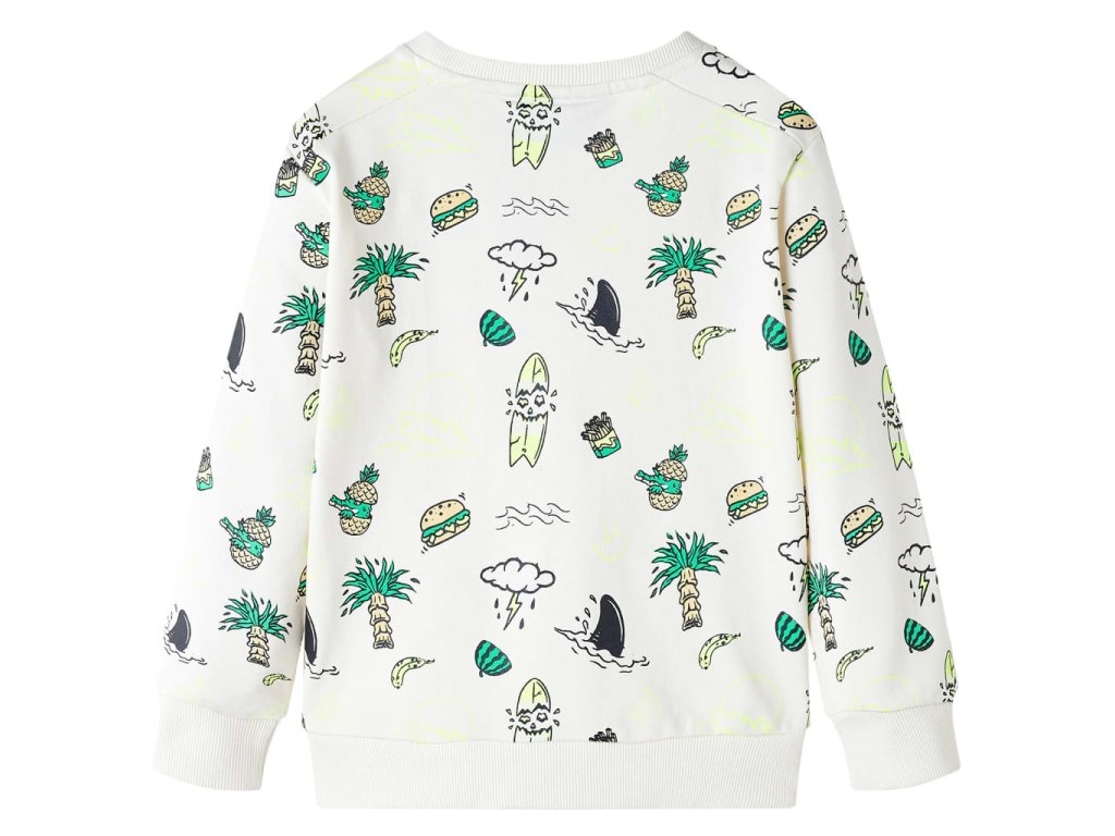 Táto detská mikina má dlhé rukávy, okrúhly výstrih a rebrované lemy na manžetách, výstrihu a v spodnej časti. Detský top má farebnú celoplošnú potlač. Pulóverová mikina je vyrobená z 80% bavlny a 20% polyesteru pre pohodlie a priedušnosť.
