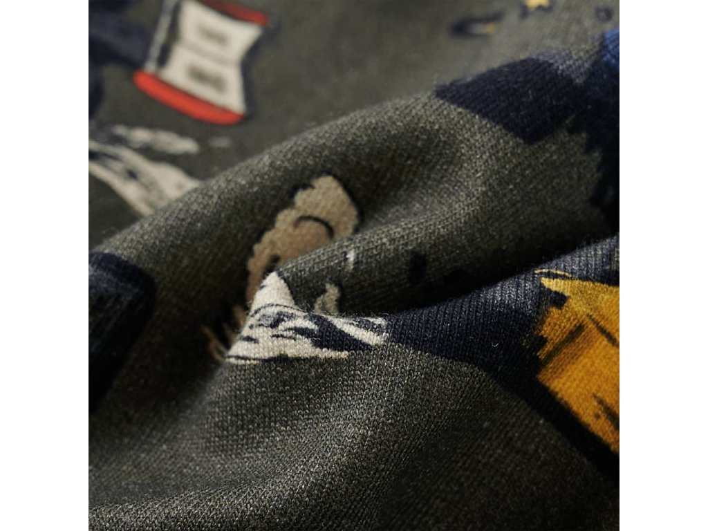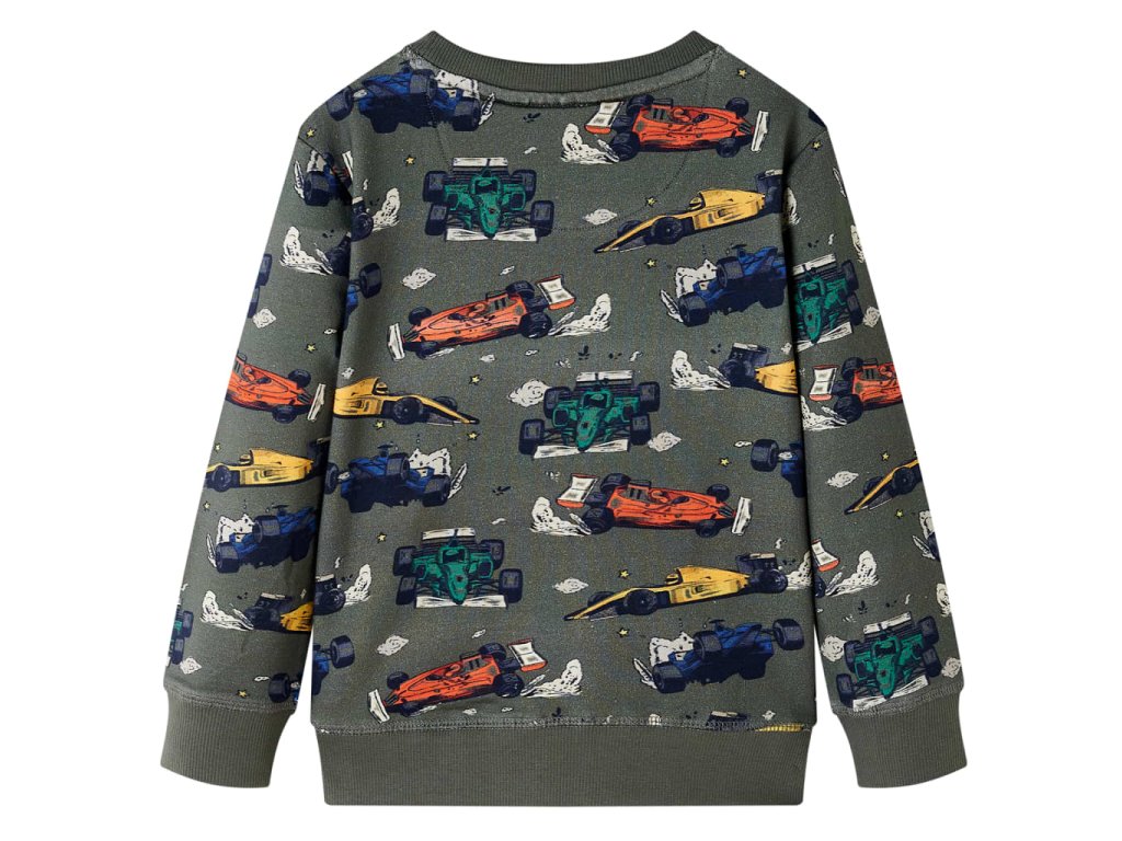 Táto detská mikina má dlhé rukávy, okrúhly výstrih a rebrované lemy na manžetách, výstrihu a v spodnej časti. Detská mikina má celoplošnú potlač pretekárskych áut. Pulóverová mikina je vyrobená z 95% bavlny a 5% elastanu pre pohodlie a priedušnosť.