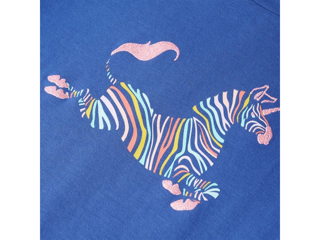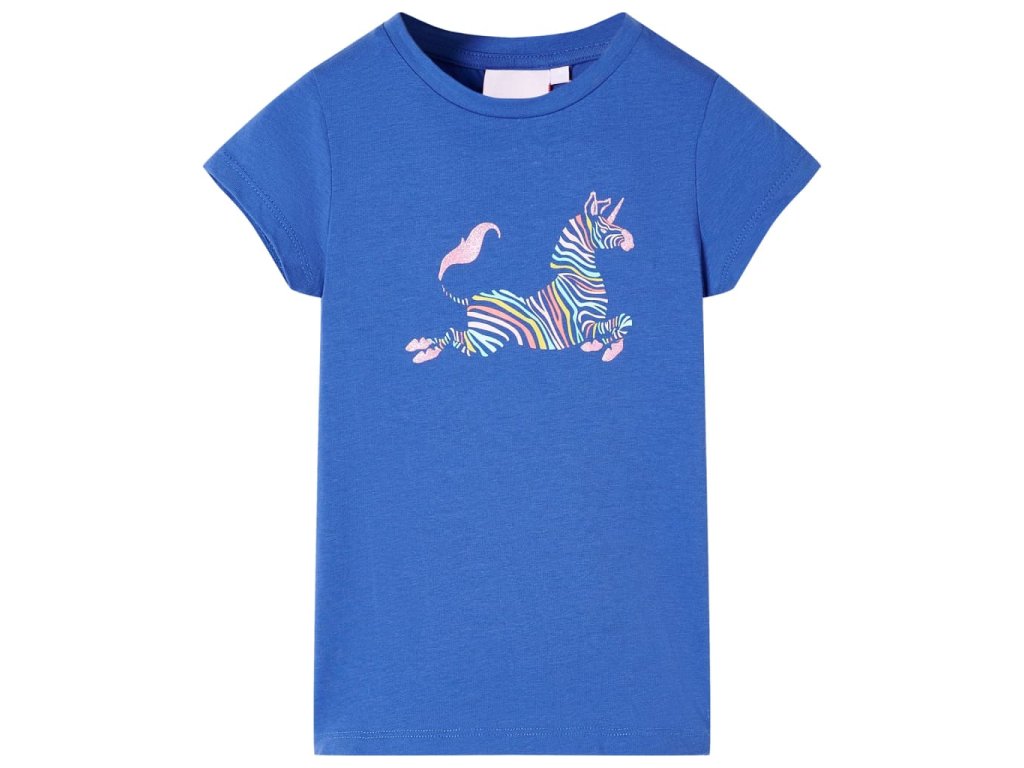 Toto detské tričko má krátke rukávy, okrúhly výstrih a rovný strih. Toto modré tričko má na hrudi farebného jednorožca. Detské tričko s krátkym rukávom je vyrobené z 95% bavlny a 5% elastanu pre pohodlie a priedušnosť.