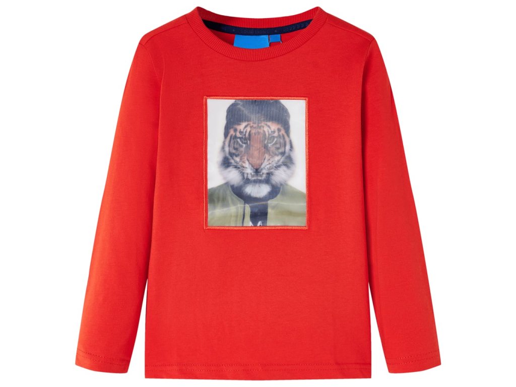 Toto detské tričko má dlhé rukávy, okrúhly výstrih a rovný model. Na tomto červenom tričku je zobrazený veľký tiger. Detské tričko s dlhým rukávom je vyrobené zo 100% bavlny jemnej a príjemnej na dotyk.