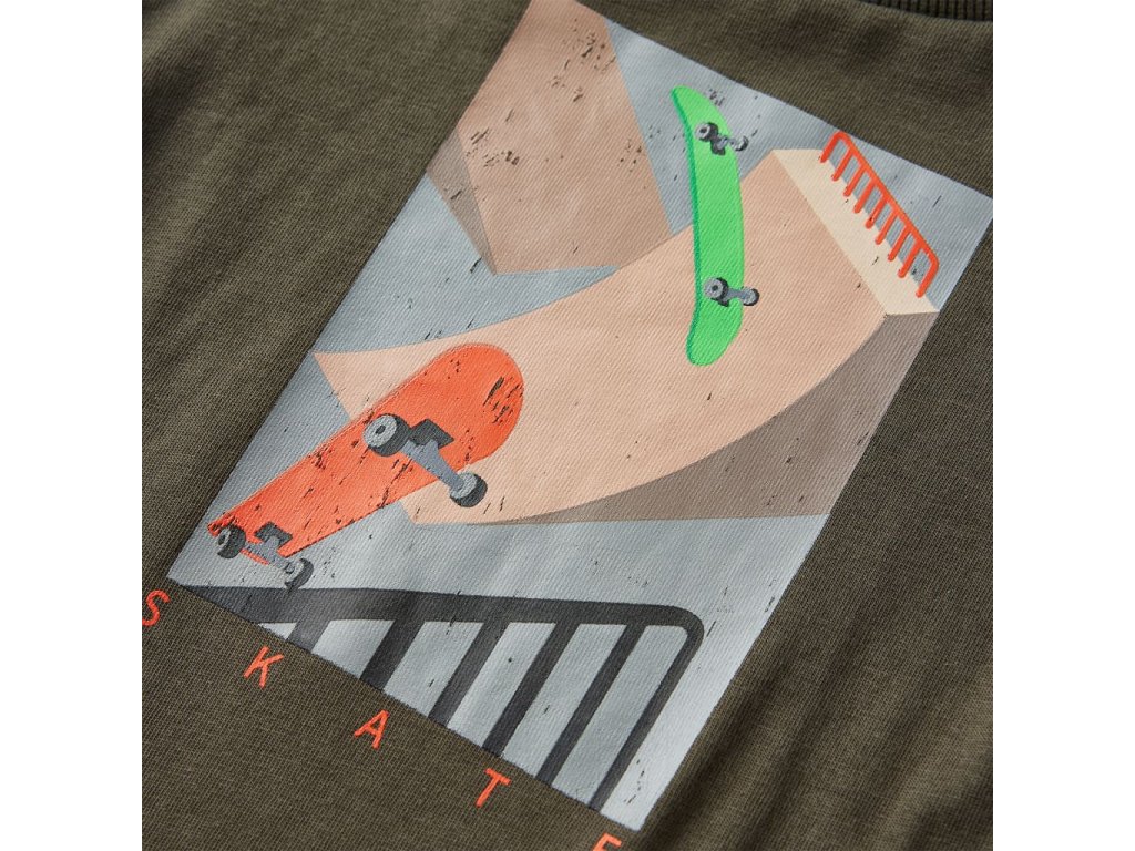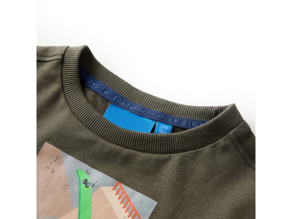 Toto detské tričko má dlhé rukávy, okrúhly výstrih a rovný model. Toto khaki tričko zobrazuje skateboardy. Detské tričko s dlhým rukávom je vyrobené zo 100% bavlny, ktorá je ošetrená silikónovým a enzymatickým praním pre mäkký a pohodlný dotyk.