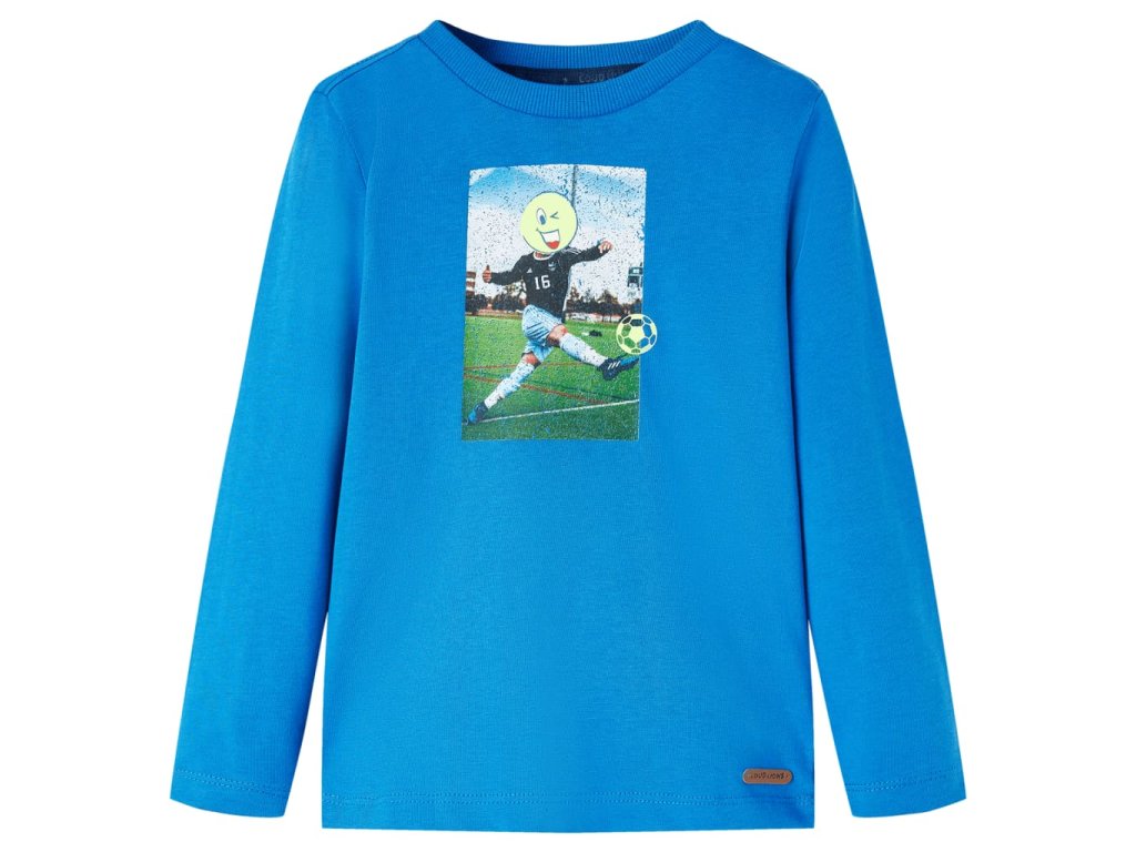 Toto detské tričko má dlhé rukávy, okrúhly výstrih a rovný model. Toto kobaltovo modré tričko zobrazuje futbalového hráča. Detské tričko s dlhým rukávom je vyrobené zo 100% bavlny, ktorá je ošetrená silikónovým a enzymatickým praním pre mäkký a pohodlný dotyk.