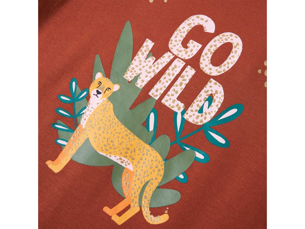 Toto detské tričko má dlhé rukávy, okrúhly výstrih a rovný model. Toto tričko vo farbe koňaku má na hrudi krásne zvieratko, rastliny a nápis „Go Wild“. Detské tričko s dlhým rukávom je vyrobené z mäkkého materiálu s obsahom 95% bavlny a 5% elastanu pre extra pohodlie a priedušnosť.
