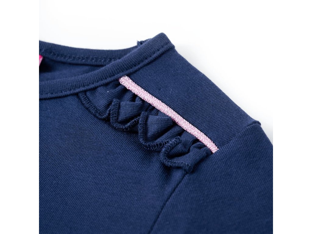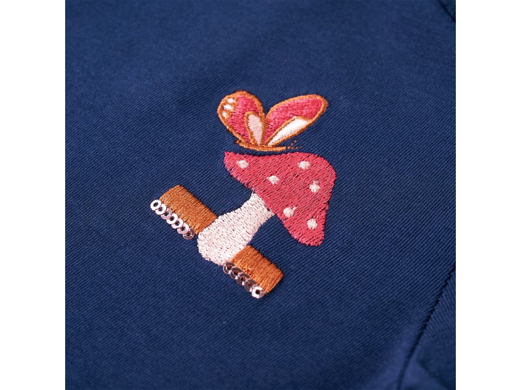 Toto detské tričko má dlhé rukávy, okrúhly výstrih a rovný model. Volán so zodpovedajúcimi trblietavými lemami. Toto tmavomodré tričko zobrazuje hubu a roztomilého motýľa na hrudi. Detské tričko s dlhým rukávom je vyrobené z mäkkého materiálu s obsahom 95% bavlny a 5% elastanu pre extra pohodlie a priedušnosť.