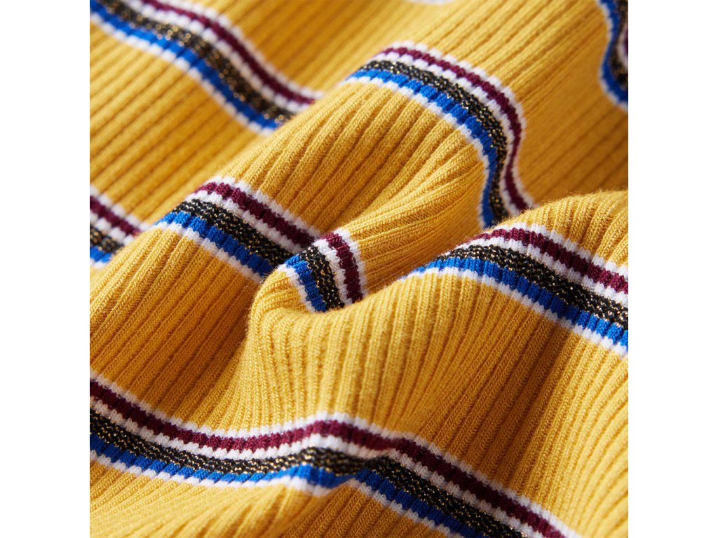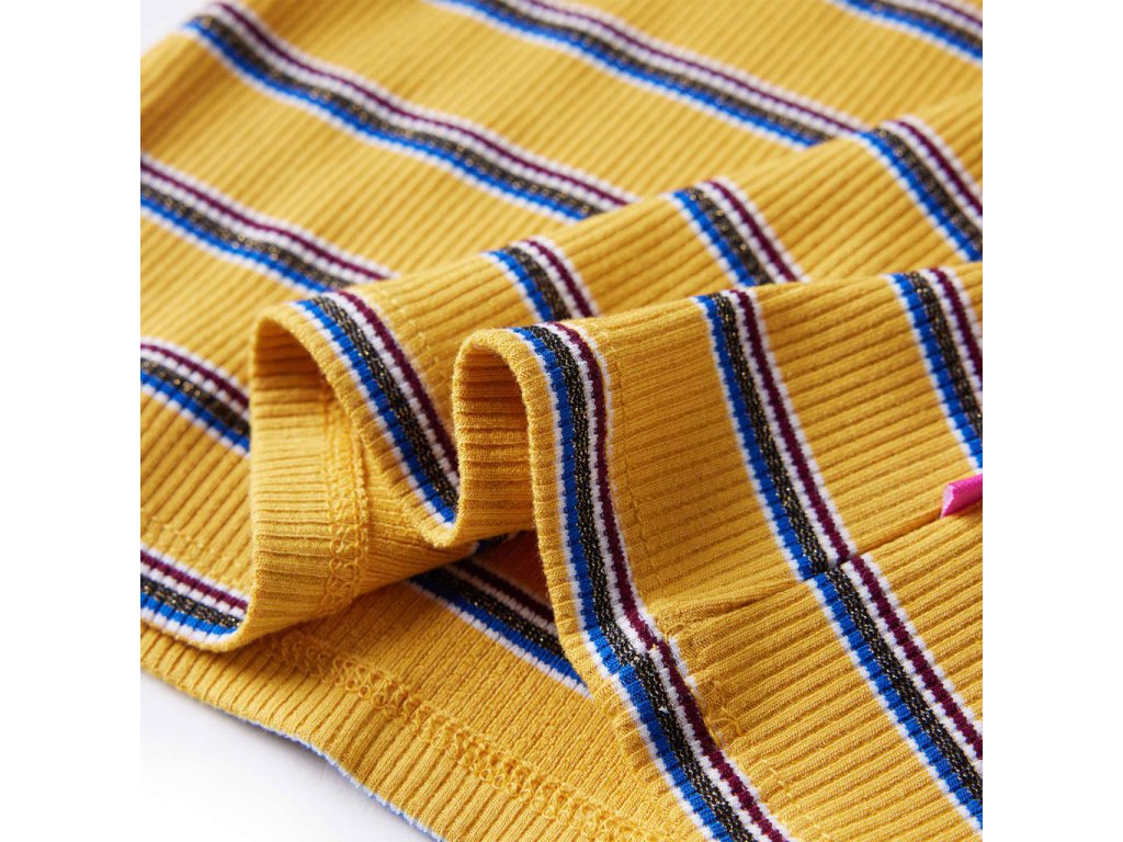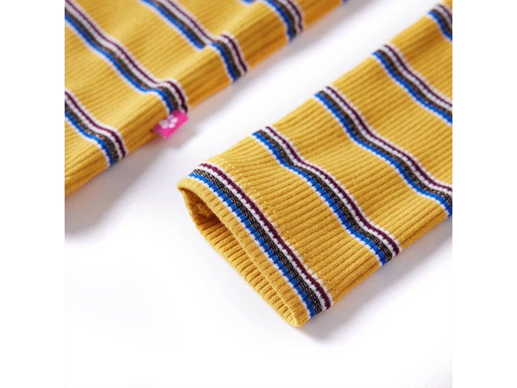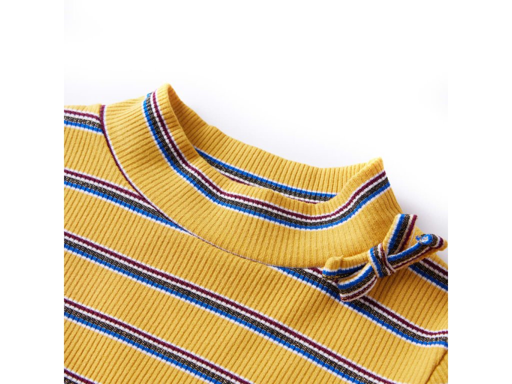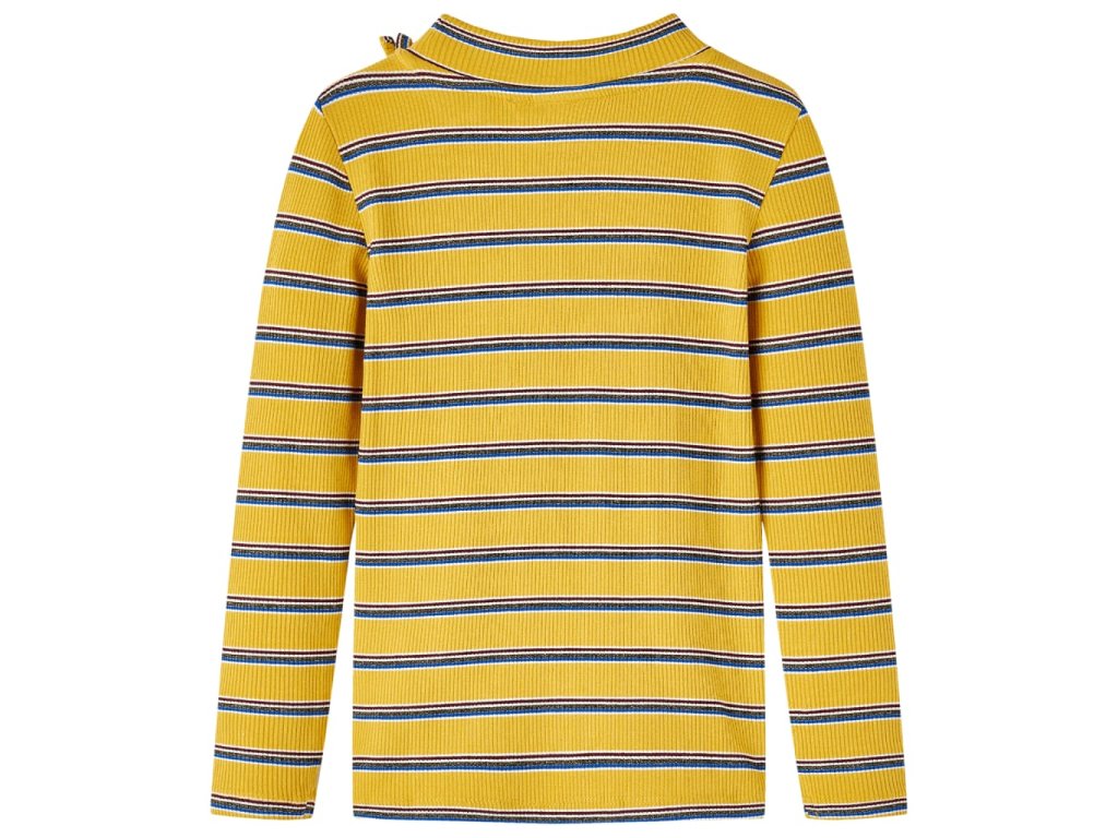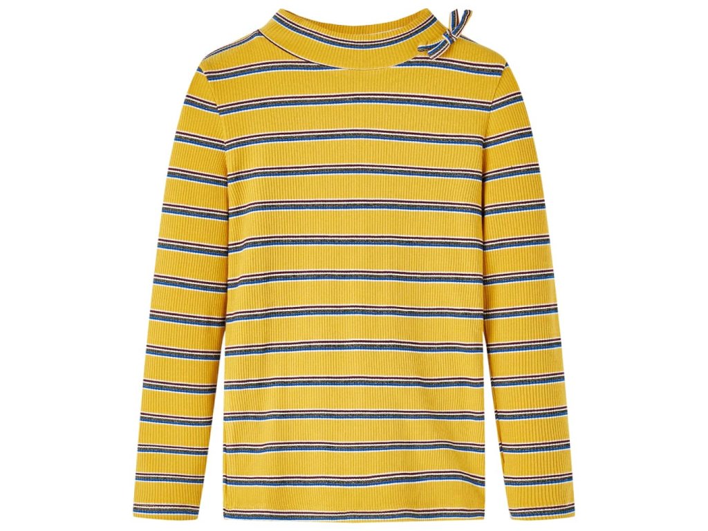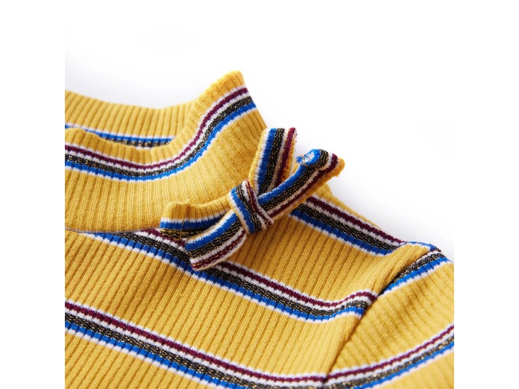Toto detské tričko z rebrovaného úpletu má dlhé rukávy, polovičný rolák a rovný model. Toto okrové tričko má na výstrihu malú mašľu. Detské tričko s dlhým rukávom je vyrobené z mäkkého materiálu s obsahom 80 % umelého hodvábu a 15 % polyesteru a 5 % elastanu pre extra pohodlie a priedušnosť.