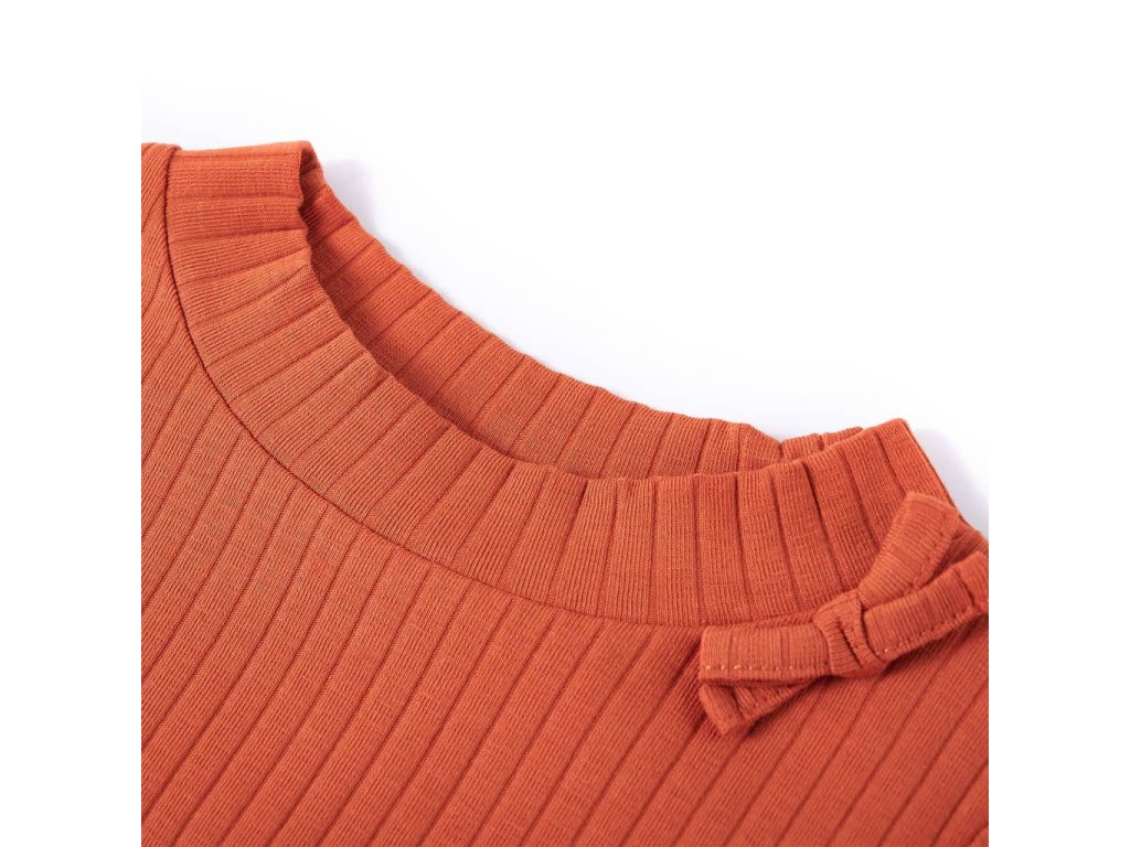 Toto detské tričko má dlhé rukávy, okrúhly výstrih a rovný model. Toto tričko v spálenej oranžovej je zdobené mašľou. Detské tričko s dlhým rukávom je vyrobené z mäkkého materiálu s obsahom 95% bavlny a 5% elastanu pre extra pohodlie a priedušnosť.