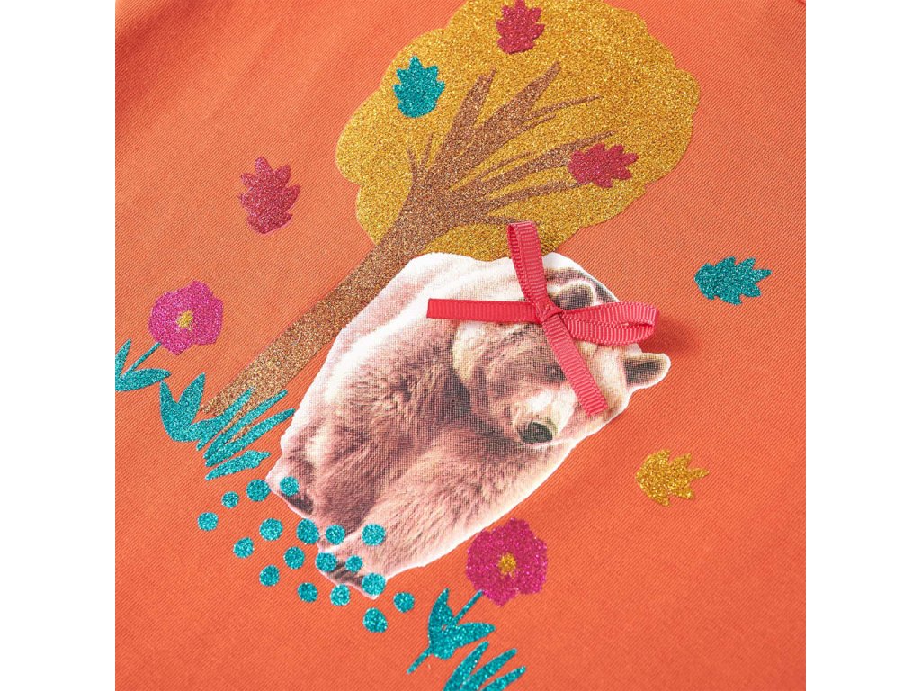 Toto detské tričko má dlhé rukávy, okrúhly výstrih a otvor v tvare kľúčovej dierky s gombíkom vzadu pri krku. Toto pálené oranžové tričko má krásnu potlač medveďa a lesklého stromu. Detské tričko s dlhým rukávom je vyrobené z mäkkého materiálu s obsahom 95% bavlny a 5% elastanu pre extra pohodlie a priedušnosť.