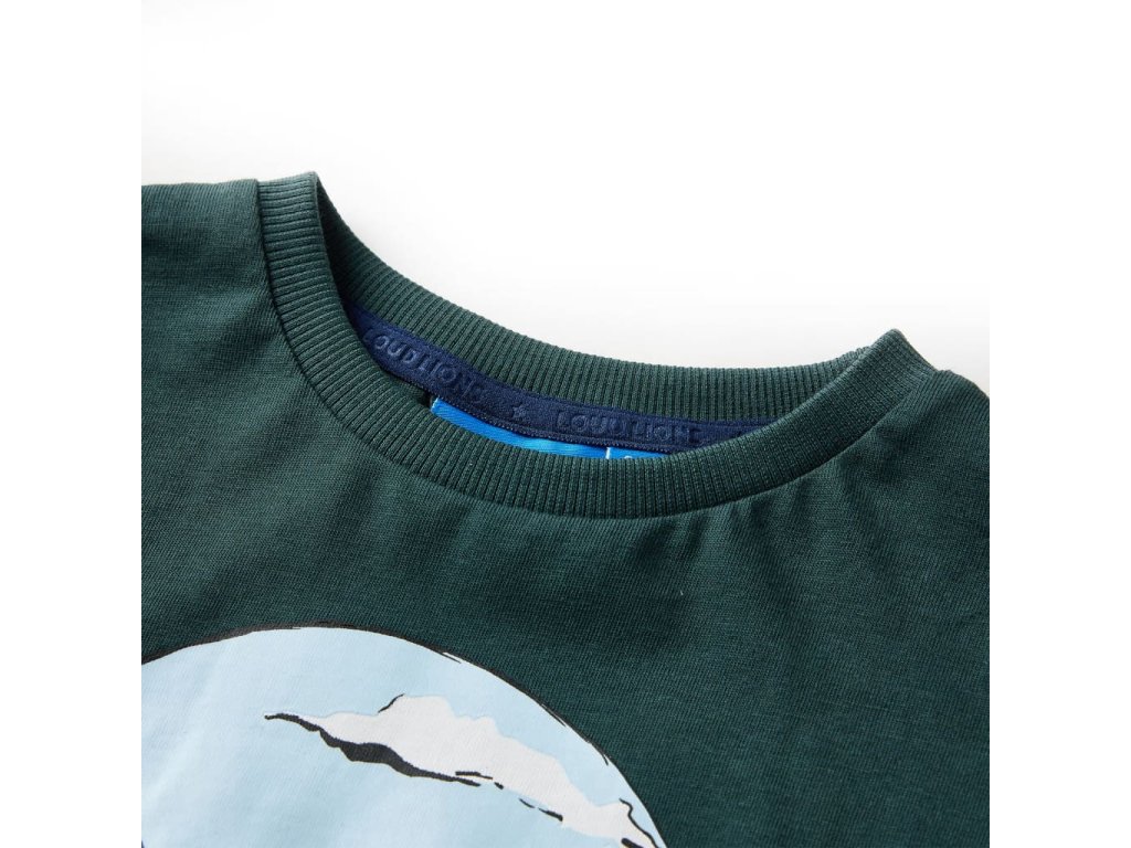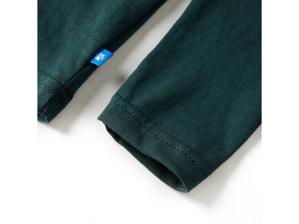 Toto detské tričko má dlhé rukávy, okrúhly výstrih a rovný model. V tomto tmavozelenom tričku sú hory a stromy. Detské tričko s dlhým rukávom je vyrobené zo 100% bavlny jemnej a príjemnej na dotyk.