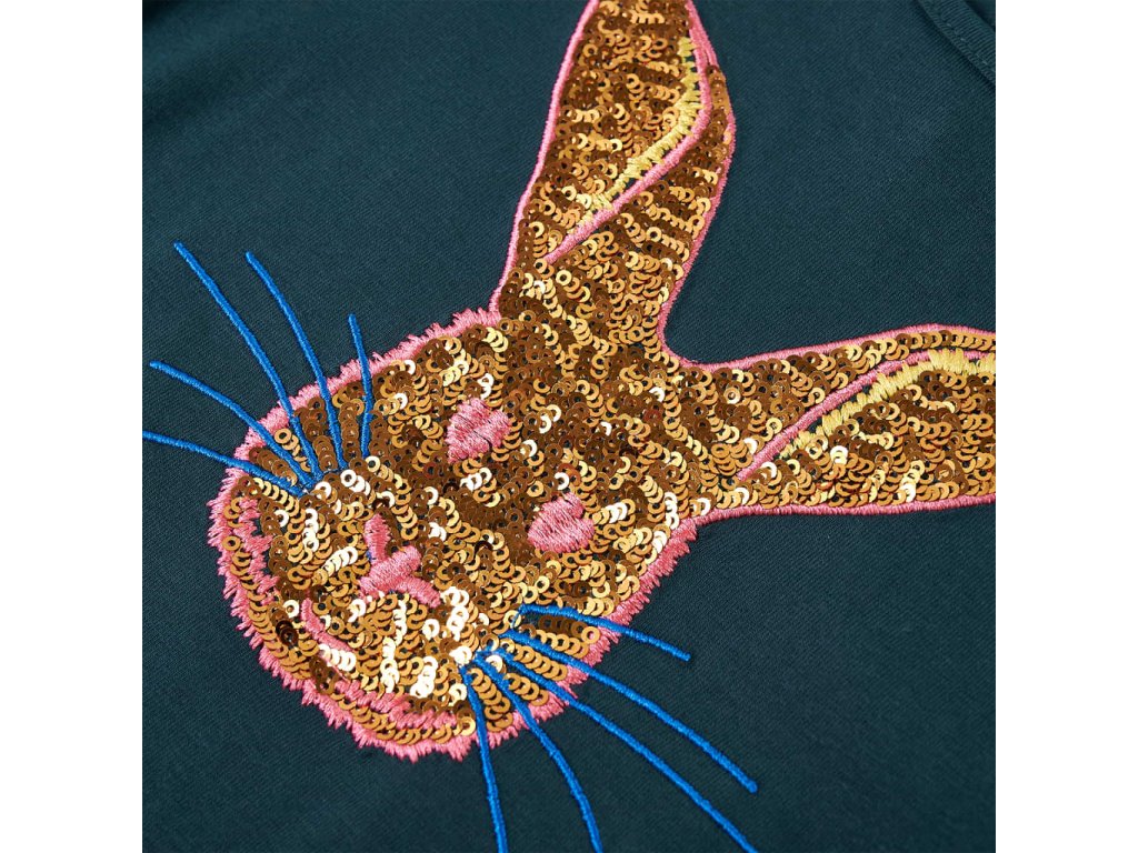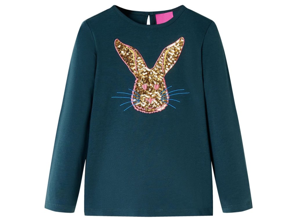 Toto detské tričko má dlhé rukávy, okrúhly výstrih a rovný model. Toto tmavozelené tričko má potlač s veľkým lesklým králikom. Detské tričko s dlhým rukávom je vyrobené z mäkkého materiálu s obsahom 95% bavlny a 5% elastanu pre extra pohodlie a priedušnosť.