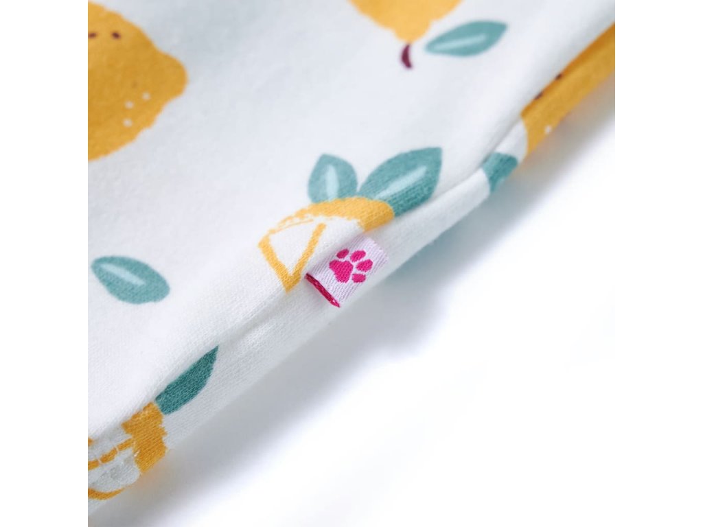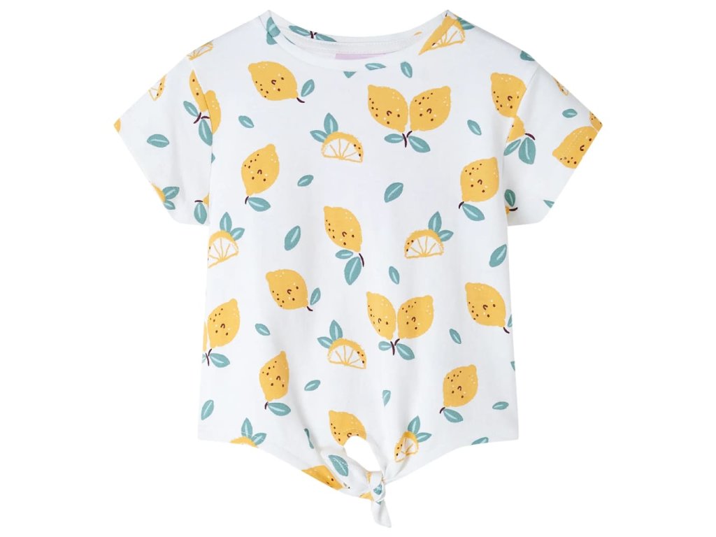 Toto detské tričko má krátke rukávy, okrúhly výstrih a rovný strih. Detské tričko má na prednej strane roztomilé vzory citrónov a viazaný spodný okraj. Tričko pre deti je vyrobené zo 100 % bavlny, ktorá je mäkká a príjemná na dotyk.