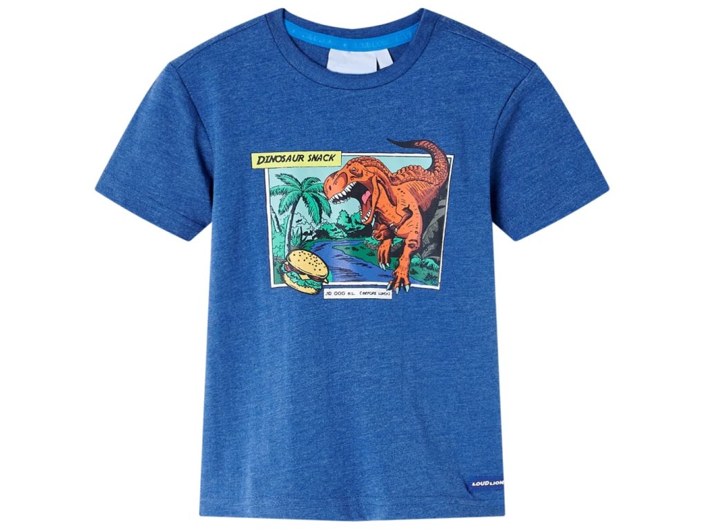 Toto detské tričko má krátke rukávy, okrúhly výstrih a rovný strih. Detské tričko má veľkú potlač dinosaura. Detské tričko s krátkym rukávom je vyrobené z 80% bavlny a 20% polyesteru pre mäkkosť a pohodlné nosenie.