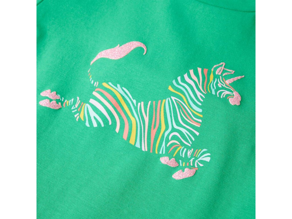 Toto detské tričko má krátke rukávy, okrúhly výstrih a rovný strih. Toto zelené tričko má na hrudi farebného jednorožca. Detské tričko s krátkym rukávom je vyrobené z 95% bavlny a 5% elastanu pre pohodlie a priedušnosť.