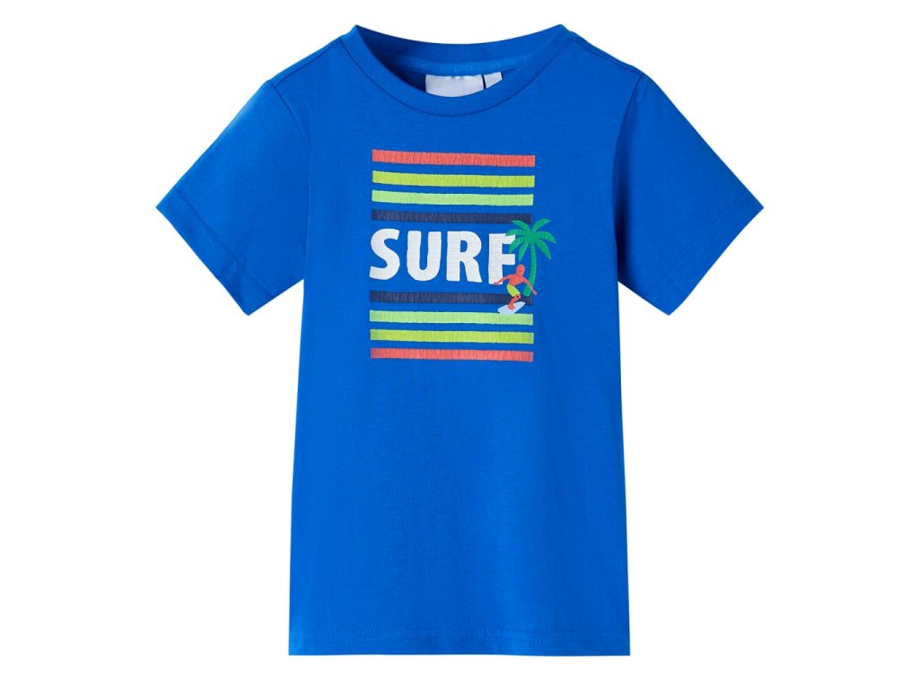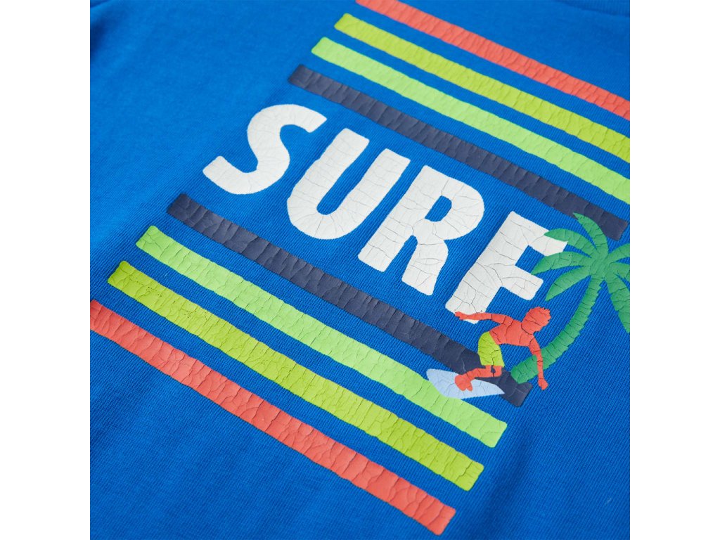 Toto detské tričko má krátke rukávy, okrúhly výstrih a rovný strih. Detské tričko má vodorovné pruhy na hrudi. Na detskom tielku je vytlačený nápis "SURF"; surfer a kokosová palma. Tričko pre deti je vyrobené zo 100 % bavlny, ktorá je mäkká a príjemná na dotyk.