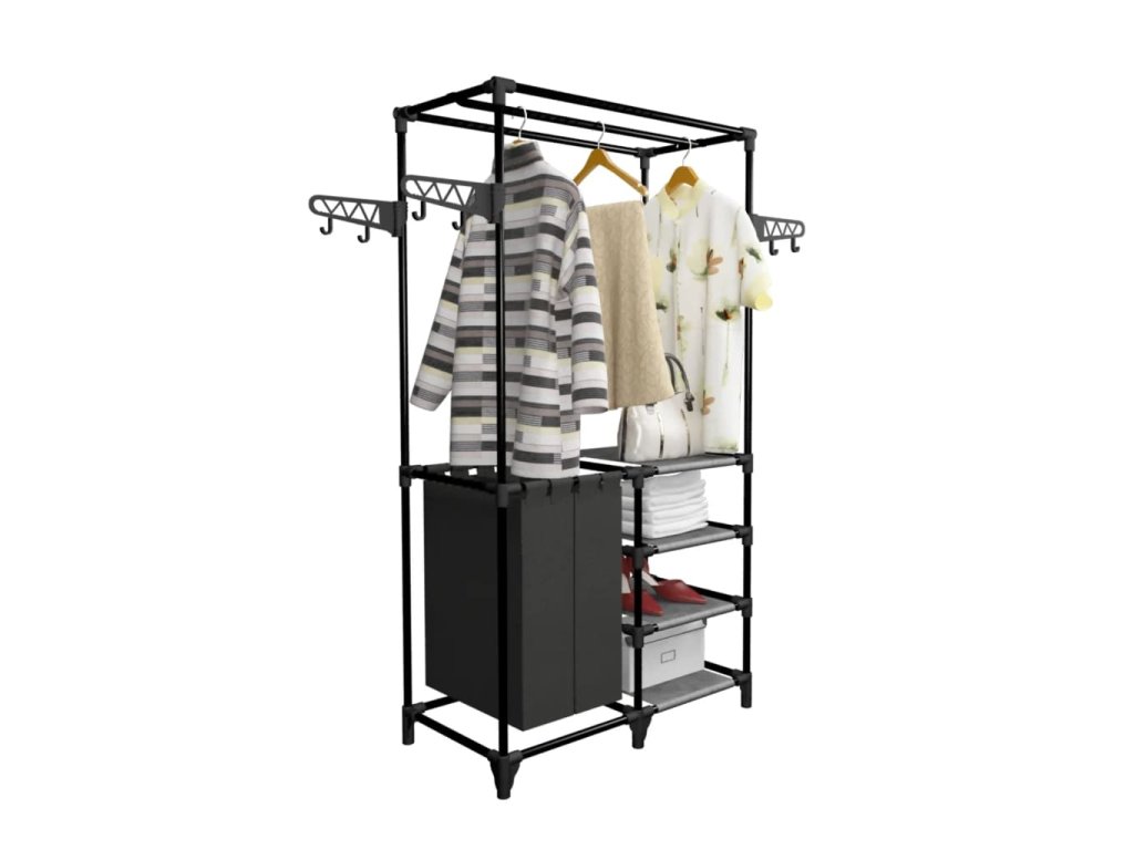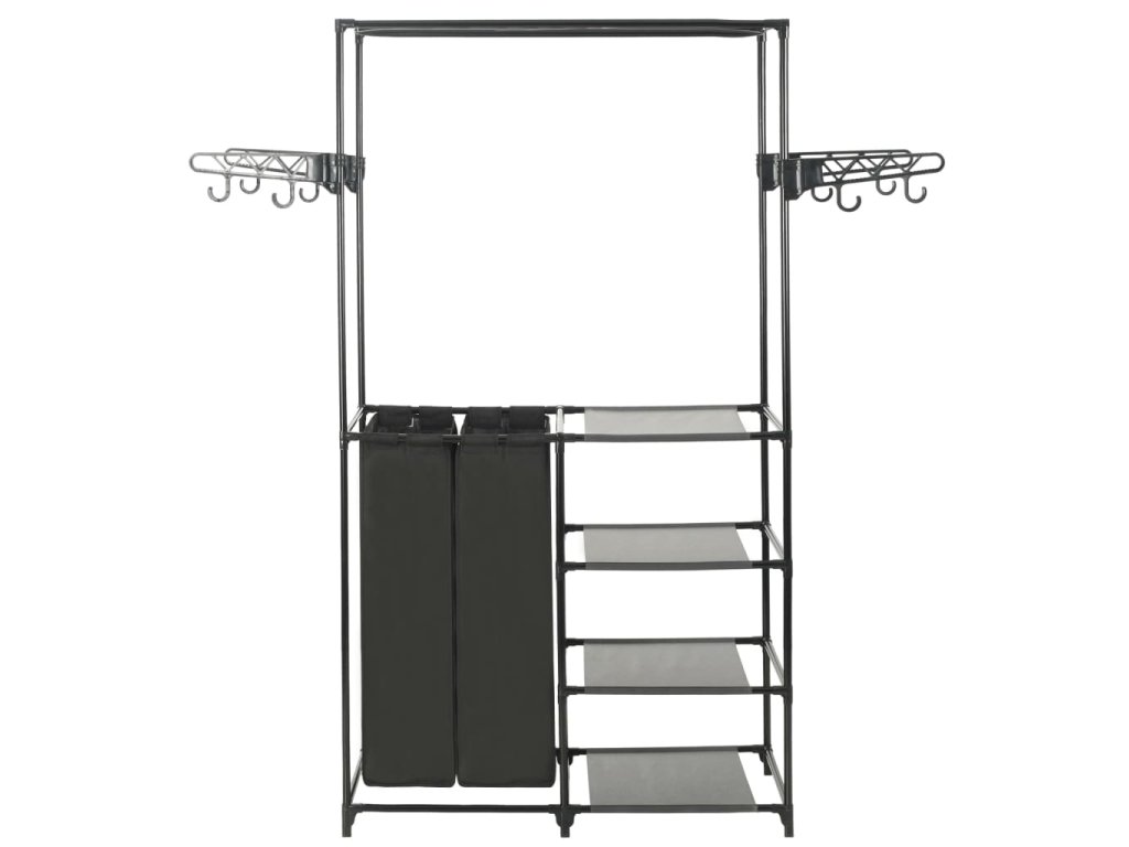 Stojan na oblečenie má rám z oceľových trúbok s práškovou povrchovou úpravou, ktorý je ľahký a zároveň pevný, vďaka čomu je naozaj trvácny a dá sa jednoducho presunúť. Stojan obsahuje dve priestranné vrecia a štyri police, ktoré sú vyrobené z netkanej látky a sú navrhnuté tak, aby ste si na ne mohli prehľadne poukladať kabelky, topánky či iné menšie predmety, ktoré tak budete mať vždy poruke. Má aj štyri postranné vešiaky s háčikmi, ktoré poskytujú dodatočný úložný priestor na dlhšie oblečenie, ako sú napríklad kabáty a bundy.