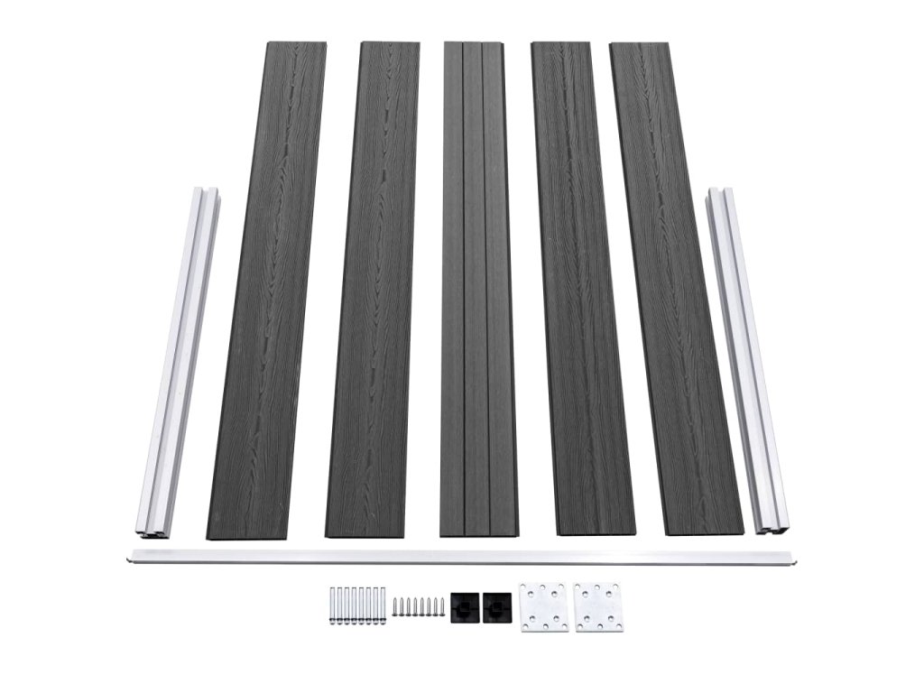 - Materiál: WPC (drevoplastový kompozit), hliník, oceľ