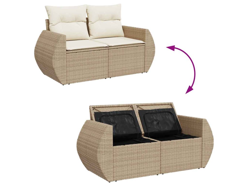 - Úložná funkcia s vodeodolnou taškou: Záhradný nábytok má úložný priestor pod sedadlom, doplnený o vodeodolnú tašku na uloženie vankúšov, hračiek a iných predmetov. Vnútorné vrecko sa dá bezpečne pripevniť k vonkajšiemu nábytku pomocou zapínania na suchý zips pre lepšiu stabilitu.