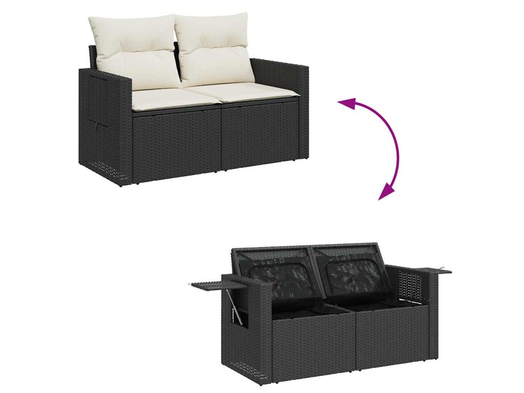 - Úložná funkcia s vodeodolnou taškou: Záhradný nábytok má úložný priestor pod sedadlom, doplnený o vodeodolnú tašku na uloženie vankúšov, hračiek a iných predmetov. Vnútorné vrecko sa dá bezpečne pripevniť k vonkajšiemu nábytku pomocou zapínania na suchý zips pre lepšiu stabilitu.