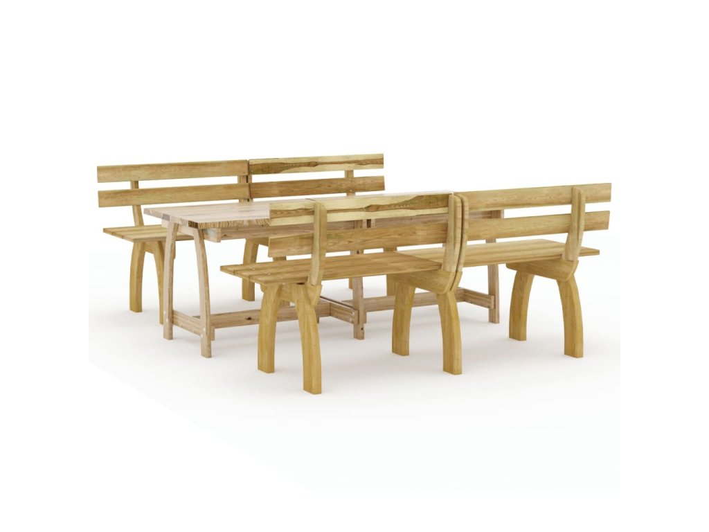 Táto drevená vonkajšia jedálenská súprava vyrobená zo zeleného impregnovaného borovicového dreva je veľmi pevná, trvácna a odolná voči korózii. Súprava nábytku je ideálnou voľbou pre chvíle oddychu v romantickej záhrade vidieckeho domu alebo pri idylickom záhradnom jazierku na večeru s rodinou a priateľmi. Upozorňujeme, že drevo je prírodný produkt a môže vykazovať nedokonalosti.