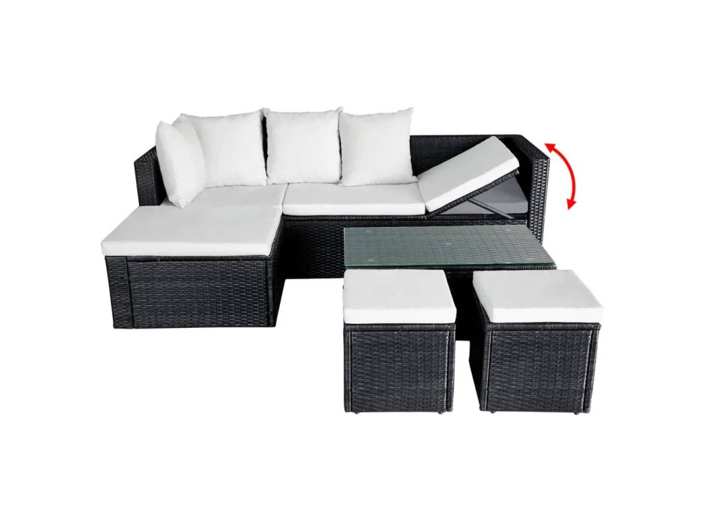 Súprava sa dodáva spolu s veľmi pohodlnými a nahusto vyčalúnenými pdoložkami na sedadlo a vankúšmi na operadlo. Poťahy podložiek a vankúšov sa dajú zvliecť a oprať. Jedna strana rohovej pohovky sa navyše dá vytiahnuť a sedadlo si môžete nastaviť do troch rôznych úrovní, aby ste si vždy našli čo najpohodlnejšiu polohu.