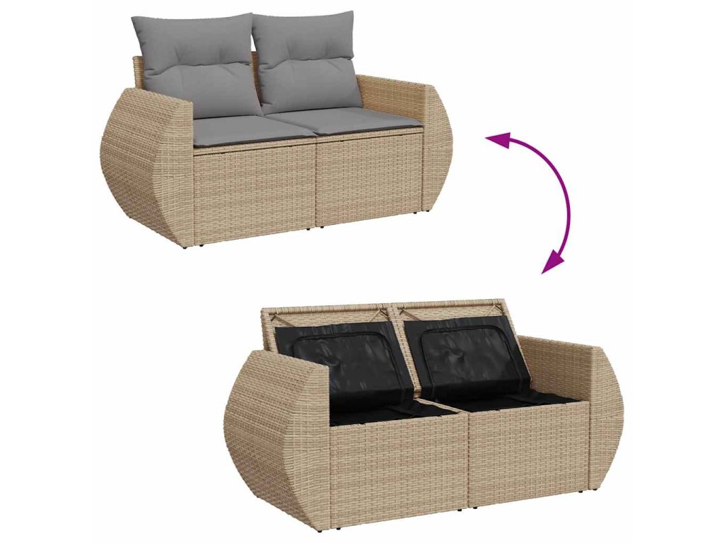 - Úložná funkcia s vodeodolnou taškou: Záhradný nábytok má úložný priestor pod sedadlom, doplnený o vodeodolnú tašku na uloženie vankúšov, hračiek a iných predmetov. Vnútorné vrecko sa dá bezpečne pripevniť k vonkajšiemu nábytku pomocou zapínania na suchý zips pre lepšiu stabilitu.