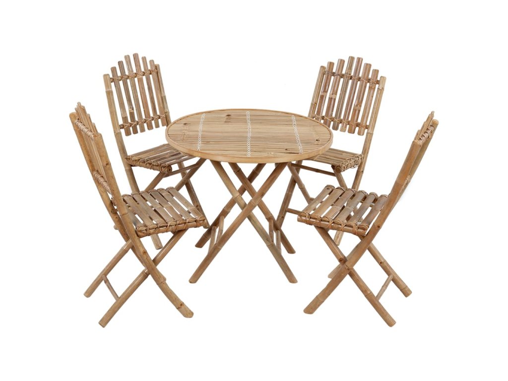 Vonkajšia jedálenská súprava je vyrobená z masívneho bambusu, a je pevná a odolná. Je tiež odolná voči poveternostným vplyvom, vodeodolná a ľahko sa čistí vlhkou handričkou. Stôl a stoličky sú skladacie, aby ste ušetrili úložný priestor, keď ich nepoužívate. Pribalená podložka poskytuje ďalšie pohodlie počas leňošenia. Je vyrobená zo 100% polyesteru, takže je pevná a dostatočne odolná, a vhodná pre vonkajšie použitie. Každý vankúš má dve sady povrázkov, ktorými sa pevne uchytí k stoličke.