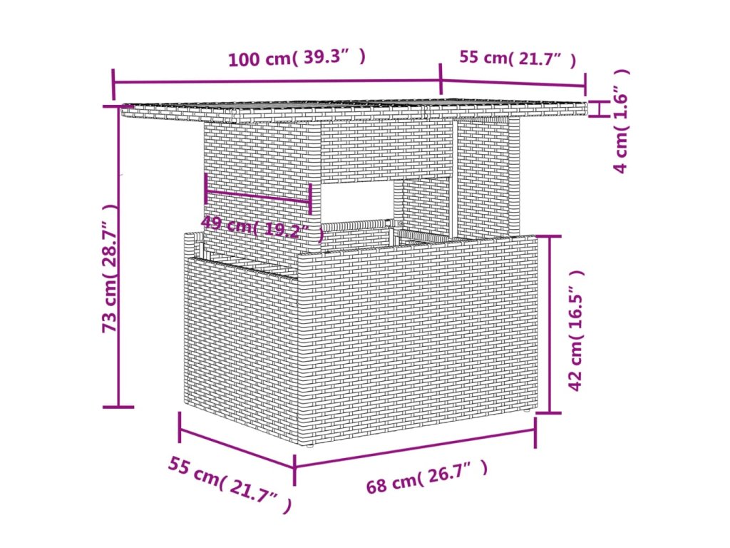 - Nastaviteľná stolová doska: Stolová doska sa dá zdvihnúť, aby bol stôl vyšší, čím sa vonkajší stôl zmení z konferenčného na jedálenský. Je ideálny na pozvanie hostí alebo jedenie vonku.