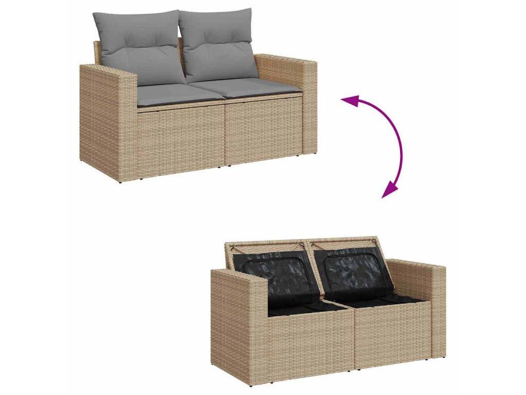 - Úložná funkcia s vodeodolnou taškou: Záhradný nábytok má úložný priestor pod sedadlom, doplnený o vodeodolnú tašku na uloženie vankúšov, hračiek a iných predmetov. Vnútorné vrecko sa dá bezpečne pripevniť k vonkajšiemu nábytku pomocou zapínania na suchý zips pre lepšiu stabilitu.