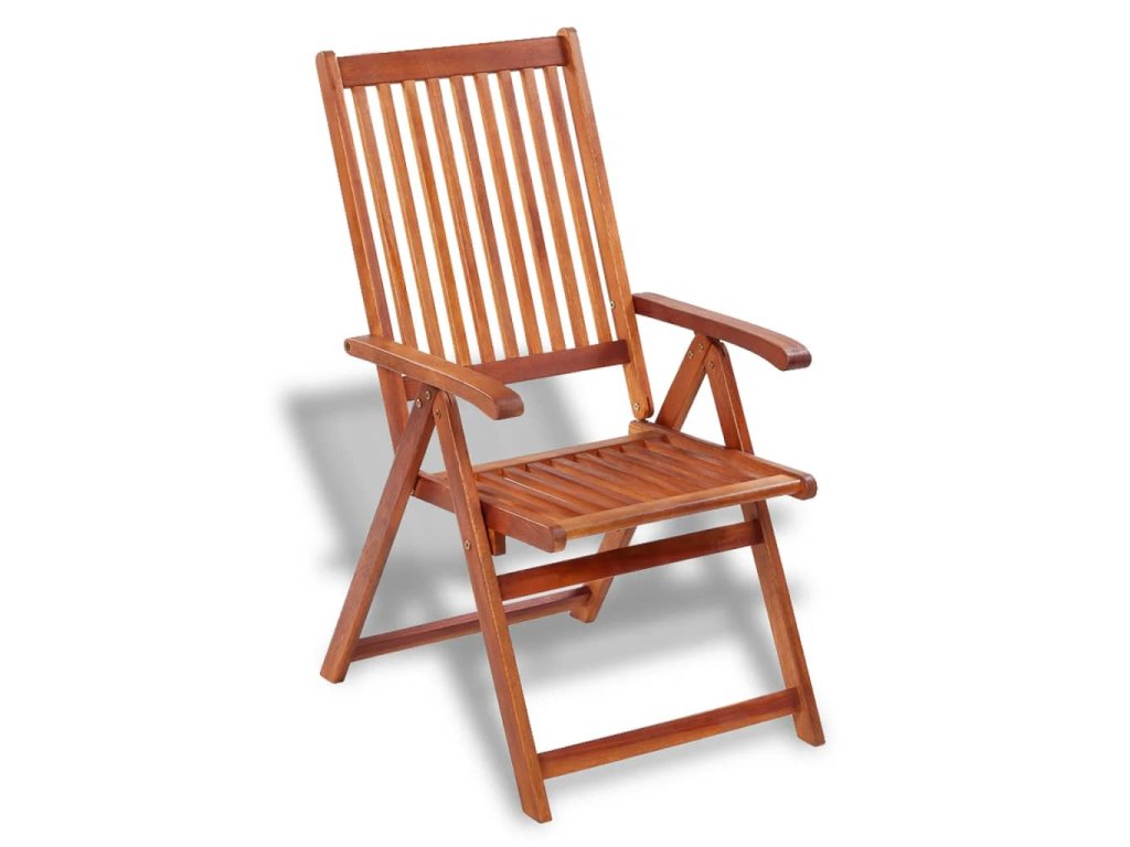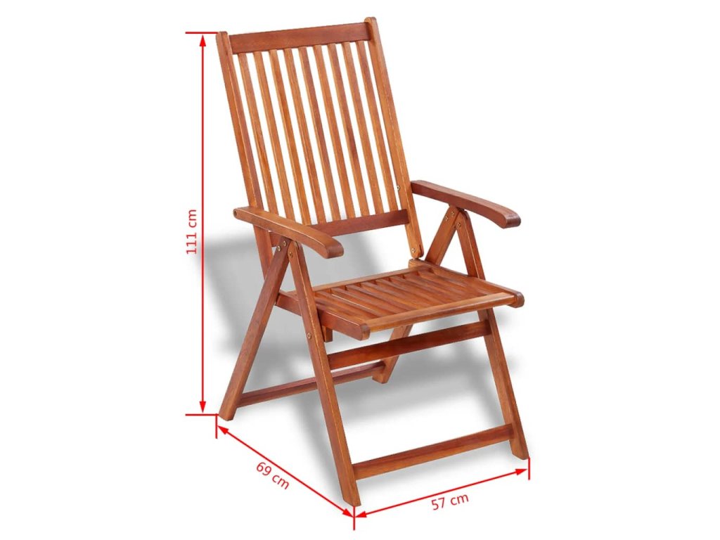 Táto jedálenská sada je vyrobená z vysokokvalitného akáciového dreva, tropického tvrdého dreva, ktoré má dlhú životnosť a je odolné voči vplyvom počasia. Povrch s olejovým náterom sa ľahko čistí pomocou navlhčenej handričky. Stoličku možno nastaviť do 5 polôh, čo vám poskytne optimálne pohodlie pri sedení. Pokiaľ sa stôl a stoličky nepoužívajú, je možné ich zložiť.