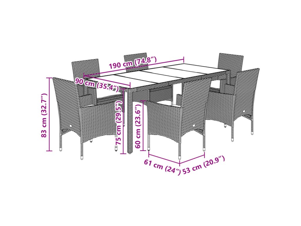 - Materiál: PE ratan, oceľ s práškovou povrchovou úpravou, tvrdené sklo