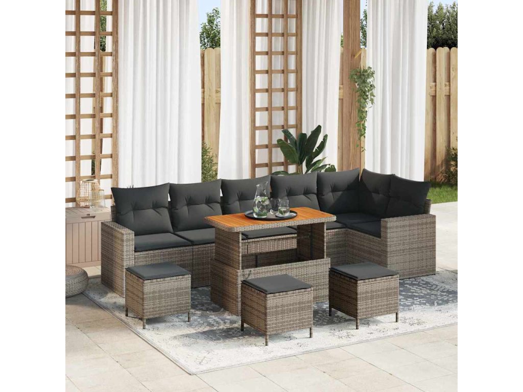 - Materiály: Tento záhradný set je predovšetkým z poly ratanu a skvelo vyzerá, takže ladí s akýmkoľvek vonkajším štýlom. Pevné akáciové drevo dodá dotyk prírodnej elegancie. Obe materiály sú odolné voči poveternostným podmienkam, takže vám vydržia dlhé roky.