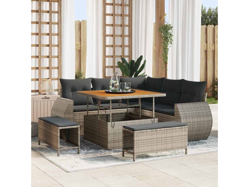 - Prémiové materiály: Tento set je vyrobený z odolného poly ratanu a akáciového dreva, čo zaručuje dlhú životnosť a odolnosť voči UV žiareniu. Tieto materiály sú nielen pevné, ale aj dodávajú elegantný vzhľad.