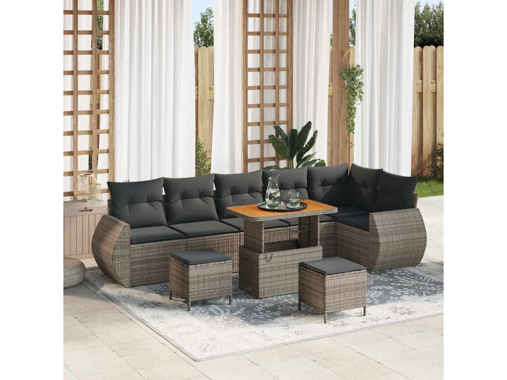 - Materiály: Set gauča je kombináciou poly ratanového a akáciového dreva. Poly ratan je odolný voči UV žiareniu a vlhkosti, takže vydrží dlhšie a zachová si krásu. Akáciové drevo dodáva celé súprave organický šarm a odolnosť.