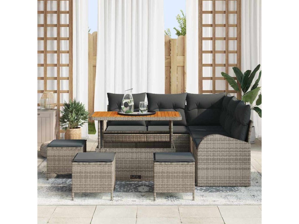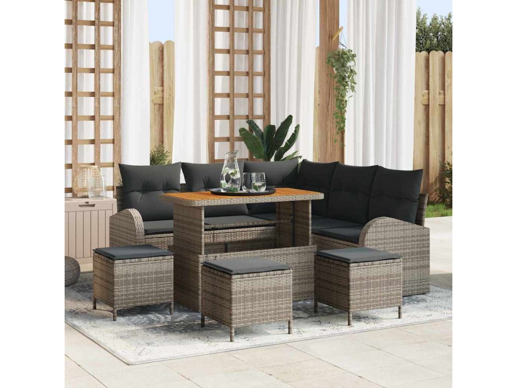 - Funkčné komponenty: S pevným akáciovým povrchom a poly ratanovými opierkami, nábytok je pohodlný a praktický. Vankúše majú praktický zips na jednoduché čistenie. Oceľové nohy sú silné a zaisťujú stabilitu a podporu pre každý kus nábytku.