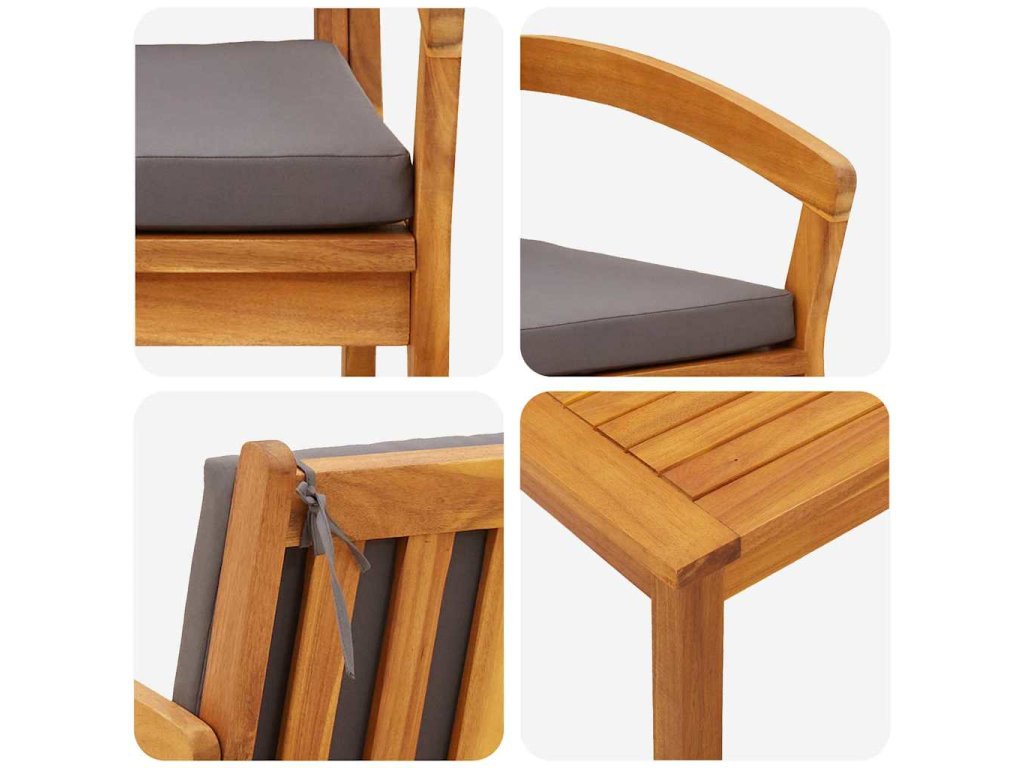 - Odolné materiály: Vyrobená z masívneho akáciového dreva, táto bistro súprava je navrhnutá tak, aby dlho vydržala. Akáciové drevo je známe svojou tvrdosťou a krásou, čo zabezpečuje, že si užijete dlhú životnosť a štýl vo vašom vonkajšom prostredí.