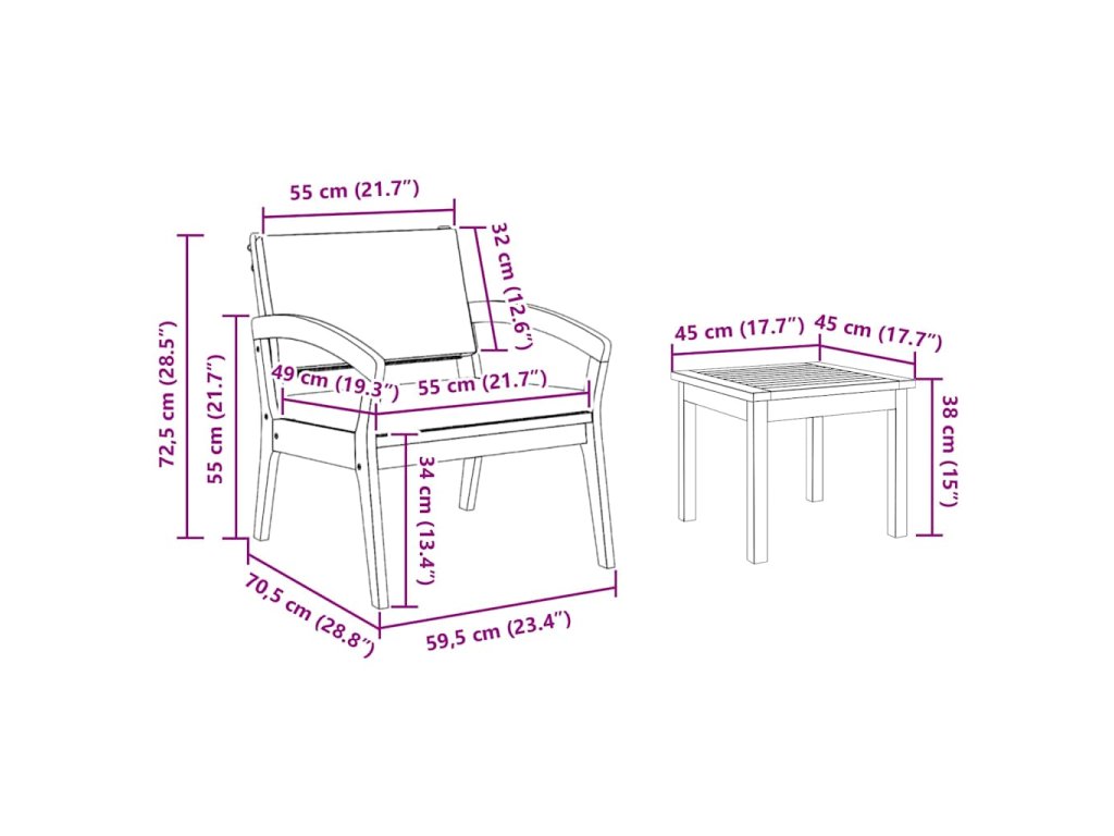 - 2 x Stolička: 59.5 x 70.5 x 72.5 cm (D x Š x V)