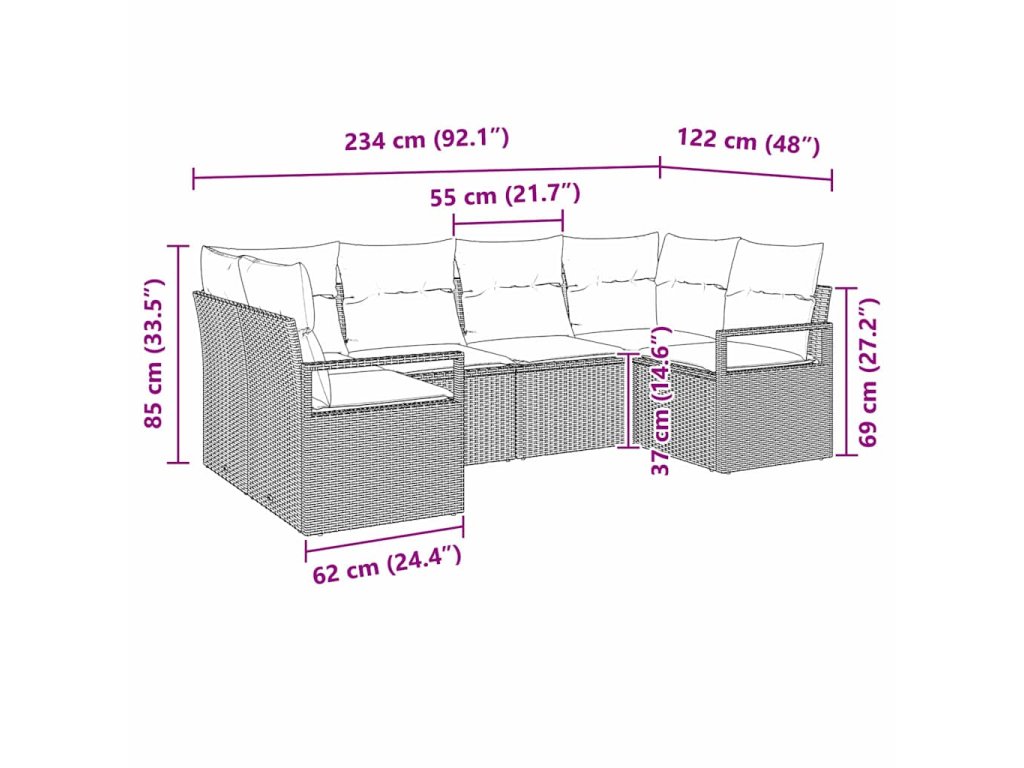 - Materiály: Pohovka je z polyratanu, ktorý je super odolný a vyzerá dobre. Vďaka svojim vlastnostiam odolným voči počasiu vydrží dlho aj vonku. Nepodlieha dažďu, UV žiareniu a bežnému opotrebeniu, čo vám dáva pokoj v duši.