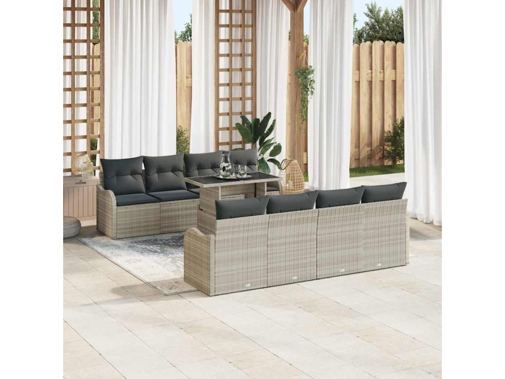 Tento moderný ratanový nábytok na terasu pojme pohodlne až deväť ľudí. S čistými líniami a jednoduchým dizajnom je perfektný na premenenie vašich vonkajších priestorov na štýlové obývačky. Vytvára príjemnú atmosféru, ideálnu na zábavu, čítanie alebo relaxovanie na slnku počas jari a leta. Modulárny dizajn umožňuje ľahké prispôsobenie a reorganizáciu.