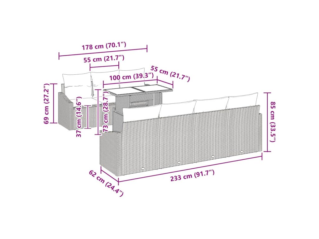 - Materiál poly ratan: Tento gaučový set je vyrobený z odolného poly ratanového materiálu, ktorý odoláva počasiu a UV žiareniu. Jeho ručne tkaná textúra dodáva vášmu vonkajšiemu prostrediu eleganciu a zabezpečuje dlhodobé používanie počas rôznych sezón.