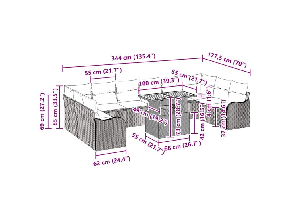 Set záhradných pohoviek kombinuje moderný design s funkčnosťou. Oživí akýkoľvek vonkajší priestor svojím štýlovým dizajnom. Získate mix kresiel, rohových a stredových sedadiel, všetko s praktickým úložiskom a pohodlnými vankúšmi, ktoré zaručujú pohodlný oddych. Tkaná textúra a čisté línie dodávajú vkusný nádych, ideálne pre moderné terasy, záhrady a patio.
