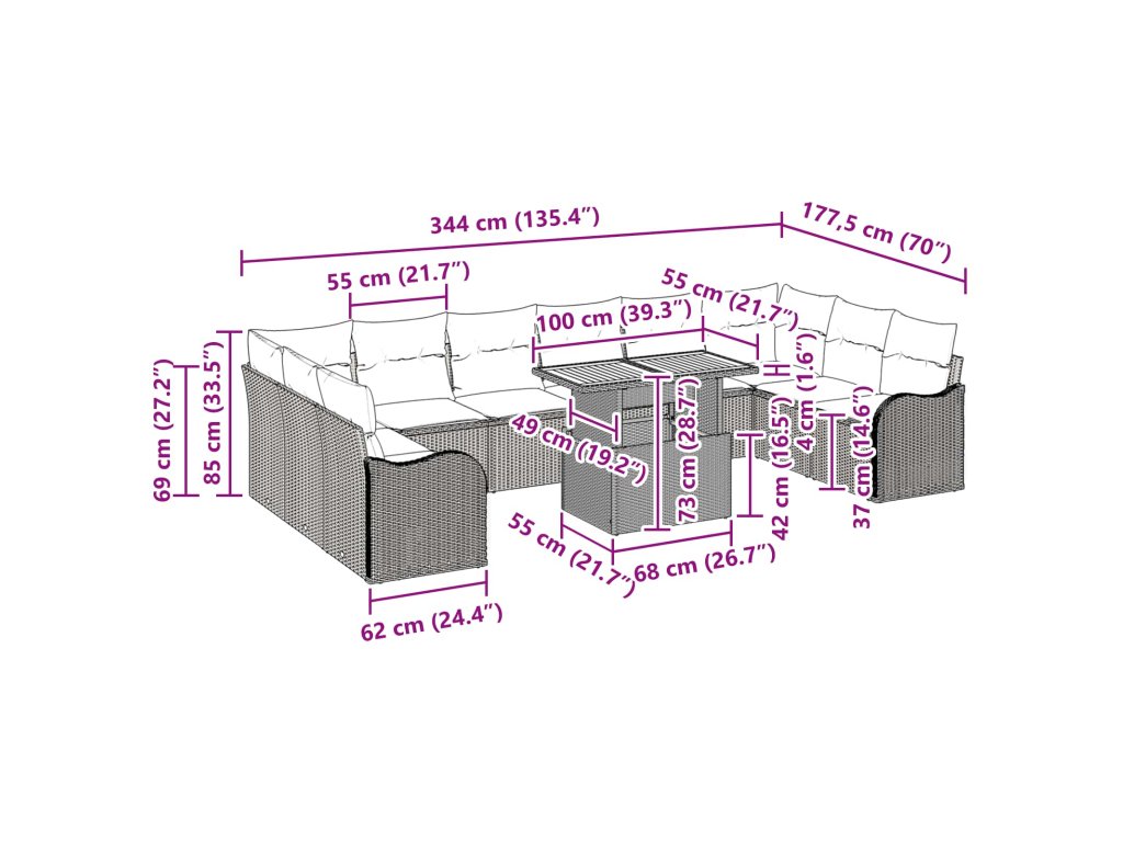 Set záhradných pohoviek kombinuje moderný design s funkčnosťou. Oživí akýkoľvek vonkajší priestor svojím štýlovým dizajnom. Získate mix kresiel, rohových a stredových sedadiel, všetko s praktickým úložiskom a pohodlnými vankúšmi, ktoré zaručujú pohodlný oddych. Tkaná textúra a čisté línie dodávajú vkusný nádych, ideálne pre moderné terasy, záhrady a patio.