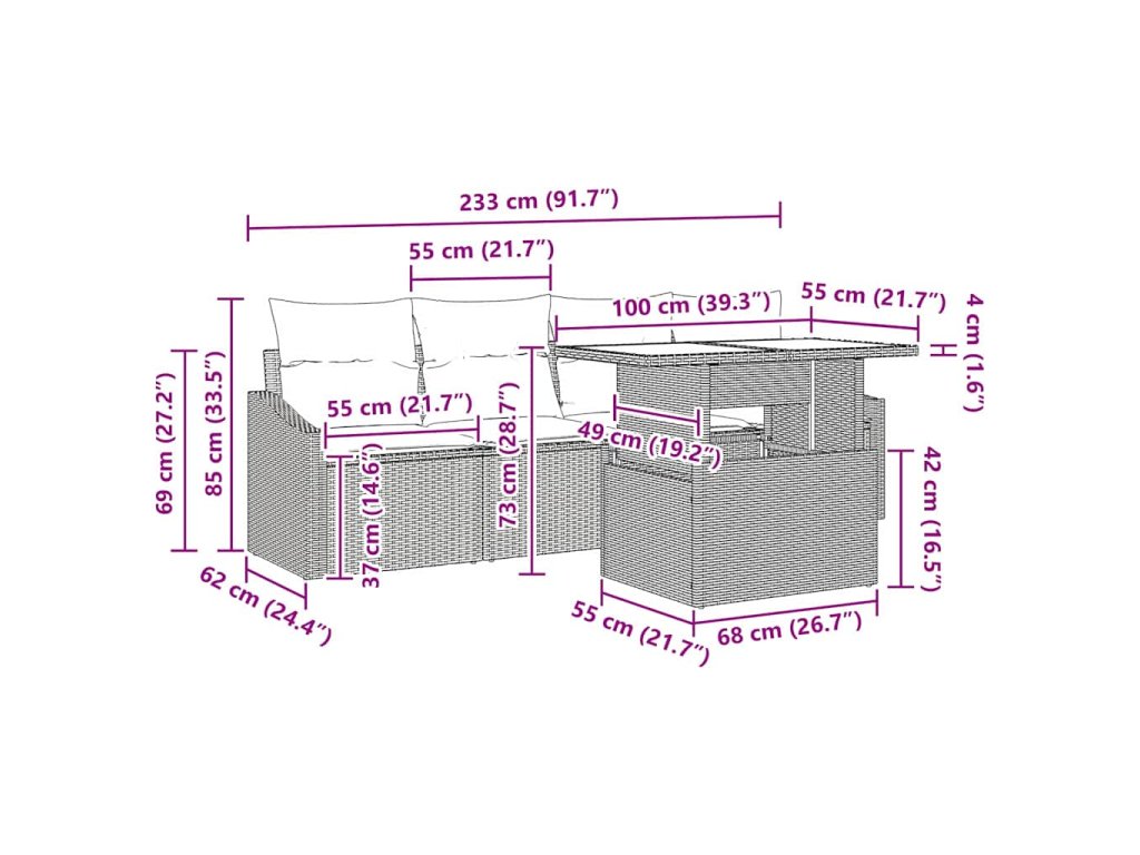 - Zahŕňajúce komponenty: Set má dve stredné sedadlá a dve opierkové pohovky s pohodlnými vankúšmi. Stôl ponúka dostatok miesta na nápoje alebo jednoducho na chatovanie.