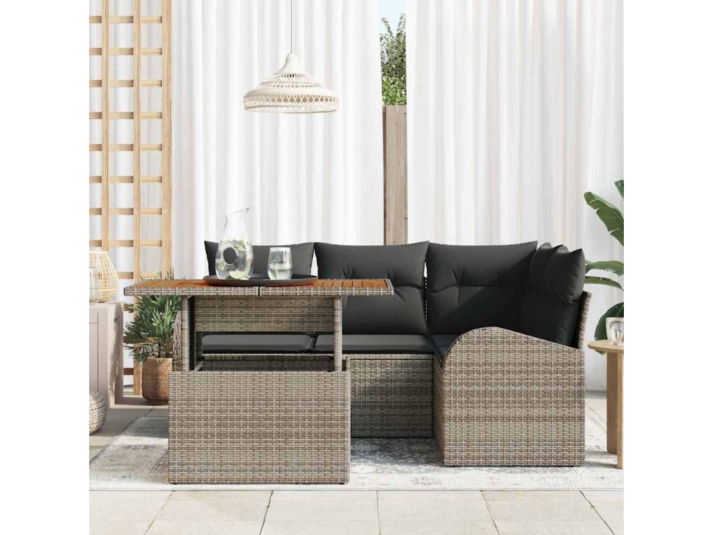 - Kvalita Materiálu: Set je vyrobený z poly ratanu, ocele so životnosťou a masívneho akáciového dreva, takže zvláda aj nepriaznivé počasie. Poly ratan vyzerá fajn a je odolný, zatiaľ čo práškovaná oceľ dodáva potrebnú pevnosť. Akáciové drevo pridáva prírodný prvok. Tieto materiály spolu robia set štýlovým a pevným.