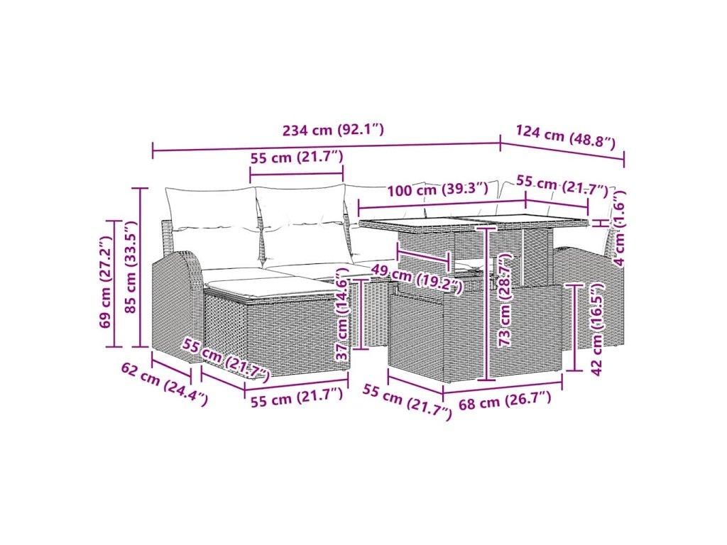 - Prémiový poly ratan: Tento set používa kvalitný poly ratan, ktorý je odolný a chráni farby pred UV žiarením, takže pohovka si udrží svoj skvelý vzhľad po celý rok. Perfektné na vonkajšie použitie, tento materiál zabezpečuje štýlový a spoľahlivý doplnok do vášho priestoru.
