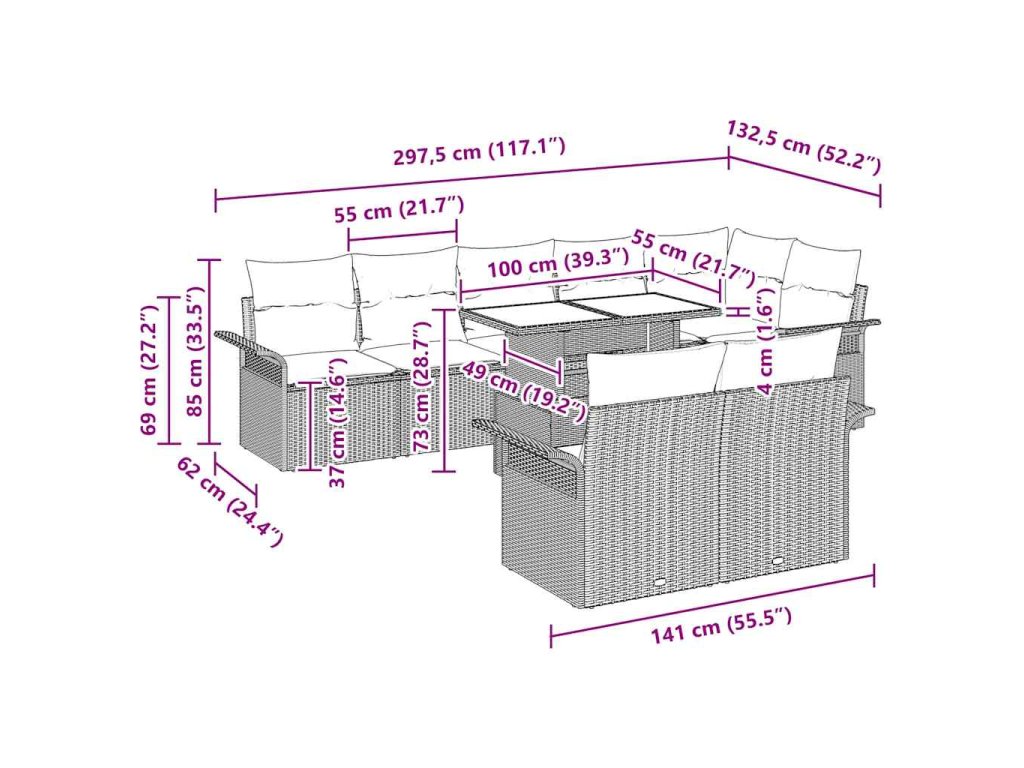 - Obsahuje komponenty Set obsahuje rohové sedenie, tri stredné sedadlá, štyri pohovky a stôl so pekným dizajnom. Vonkajšie vankúše sú pohodlné a odolné.