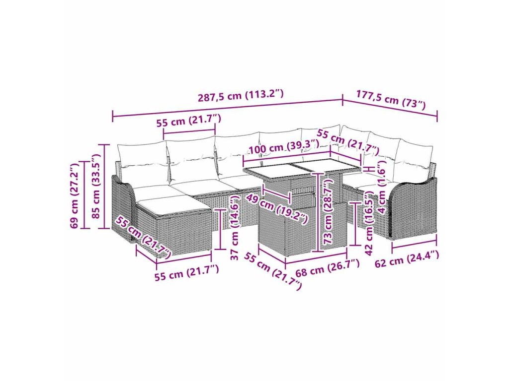 - Komplexná komponentná sada: Set obsahuje rohové sedenie, štyri centrálné sedenia, dve pohovky, priestranný taburet a variabilný stôl. Každá súčasť je navrhnutá pre maximálne pohodlie a funkciu s pridanými poduškami na sedenie pre väčšie pohodlie a zakrivenými lakťovými opierkami.