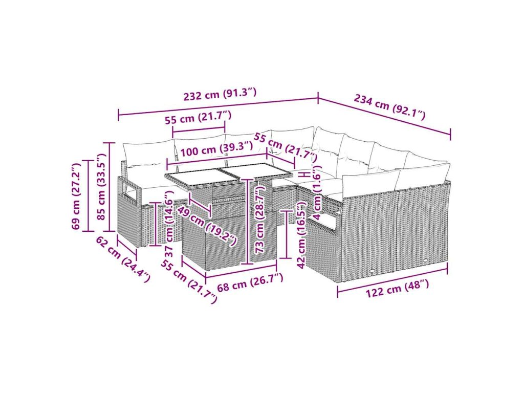 - Obsah balenia: Obsahuje rôzne sedenie, vrátane rohových a centrálnych sedačiek a stola, ideálne pre akýkoľvek vonkajší priestor.