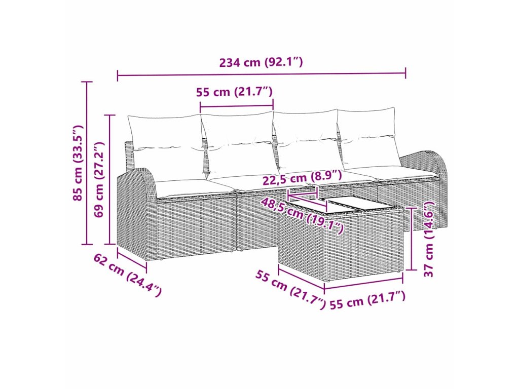 - Štýlové materiály Vyrobený z prémiového poly ratanu, tento pohovkový set má elegantnú textúru. Odolnosť poly ratanu voči UV žiareniu zabezpečuje dlhú životnosť, ideálnu na slnečné dni. Oceľová konštrukcia s práškovou úpravou je robustná a odolná voči poveternostným podmienkam, čo ho robí ideálnym na celoročné používanie.
