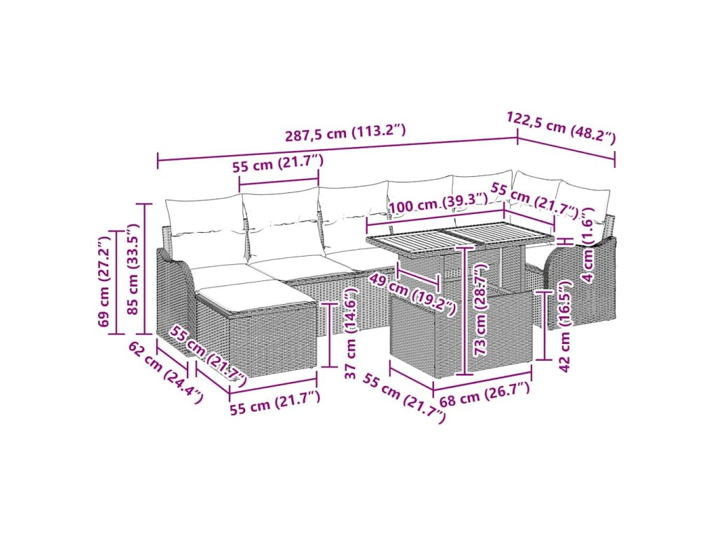 - Všetko potrebné: Set obsahuje dva armové gauče, jedno rohové sedenie, tri centrálne sedenia, taburet a stôl. Každé sedenie má úložný priestor na jednoduchú organizáciu, a stôl je super na nápoje alebo dekorácie.