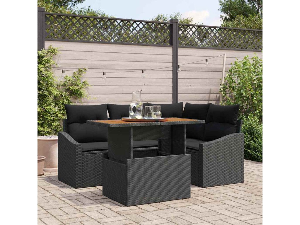 - Odolné materiály: Poly ratan a komponenty z oceľovej práškovej úpravy zabezpečujú, že súprava je odolná voči rôznym poveternostným podmienkam, poskytujúc UV ochranu a trvanlivosť pre dlhodobé vonkajšie používanie. Pevné akáciové drevené povrchy dodávajú prírodnú krásu a robustnú podporu, pričom udržiavajú atraktívny a odolný vzhľad na vašej terase alebo záhrade.