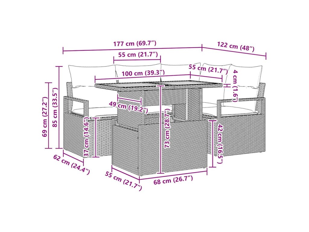 - Použité materiály: Sada je vyrobená z vysokokvalitného polyratanu, známeho svojou odolnosťou a vlastnosťami odolnými voči počasiu. Pevný stôl z akáciového dreva pridáva rustikálny šarm, doplnený robustným rámom z ocele s práškovou povrchovou úpravou, ktorý zabezpečuje odolnosť voči vonkajším prvkom.
